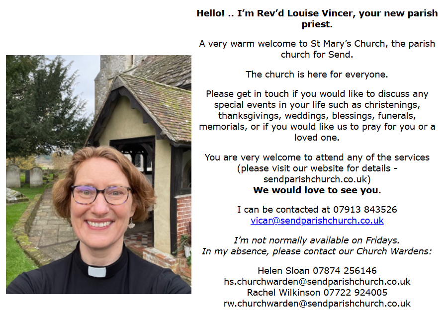 St Mary the Virgin is the parish church for the village of Send and has housed Christian Worship for 800 years. The first record of a church in Send appears in William the Conqueror's record "The Domesday Book"